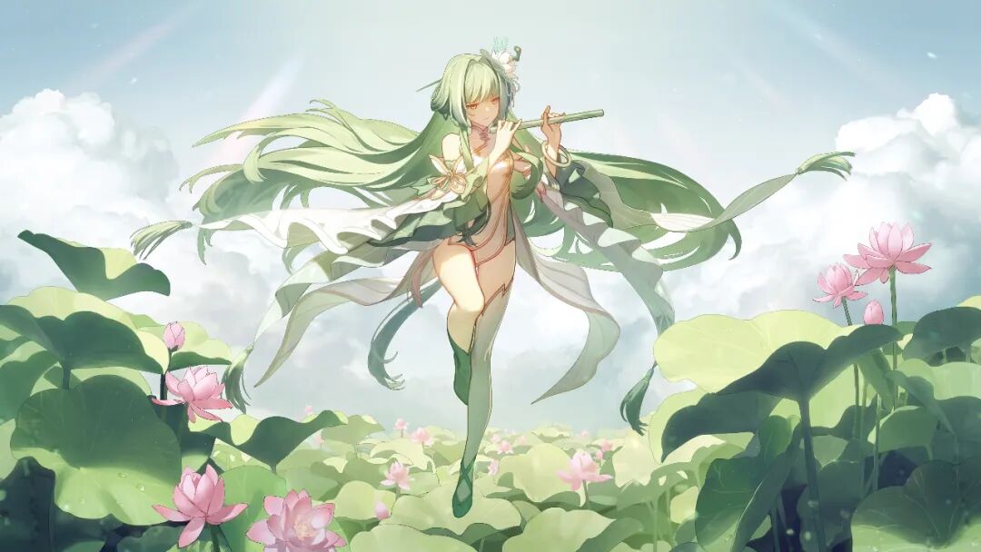 芙蕖是个典雅的御姐,身着绿白相间的旗袍领短裙,深绿长发搭配碧玺般的双眸,吹奏着乐曲唤动碧绿波涛,翡翠发簪和碧白玉箫一端各自盛开着白莲夏晓的芙蕖花,腰间也有荷叶莲花点缀,具象了纯洁与欣悦的国风花语。